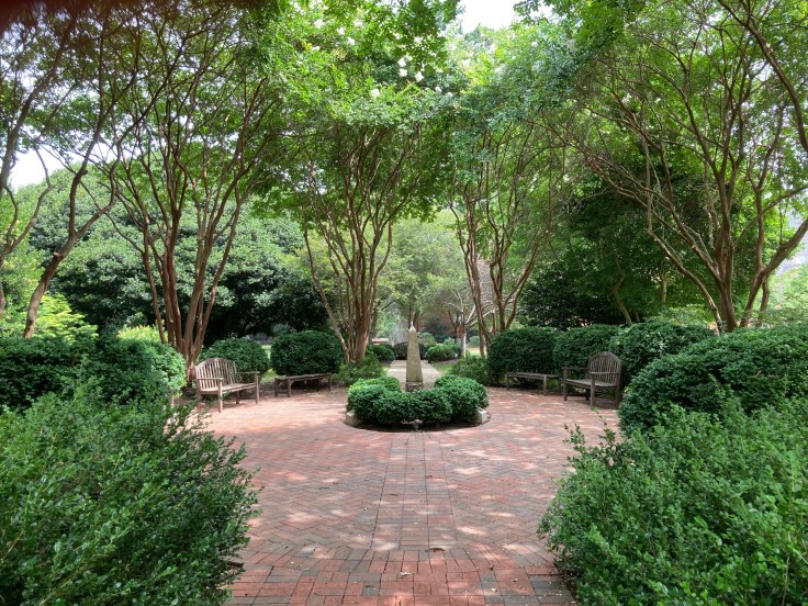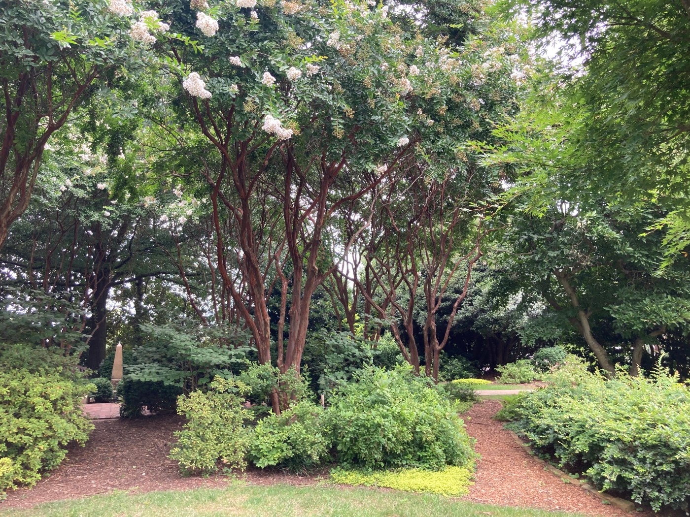 The sheltering space underneath a canopy of white crepe myrtles held the four components of a restorative environment: