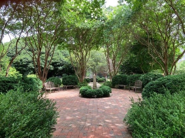 I entered a canopy of white crepe myrtles that created a sheltering space. It seemed as if two hands held an offering to any visitor. I sat on a bench and listened. The gentle bubbling of the fountain, the birdsong, the wind rustling leaves. I watched the water run down the side of the marble fountain. It was a place of peace. I felt unexpectedly happy as my eyes explored this space of details easily missed by sweeping surface glances.